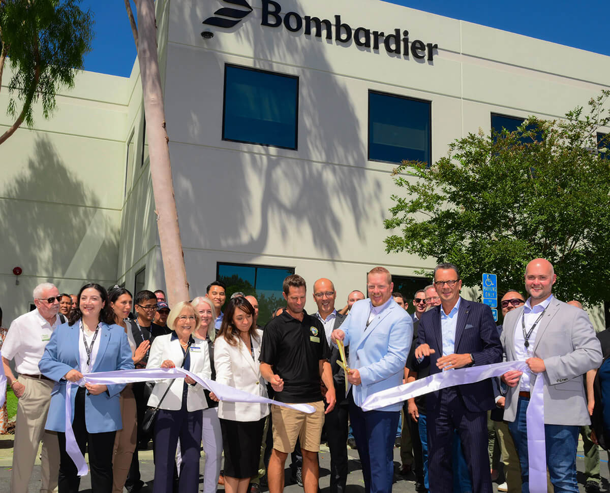 La dirección y los empleados de Bombardier, junto con líderes y representantes locales, celebran la reubicación de la planta de producción de componentes a Los Ángeles. Fuente: Bombardier