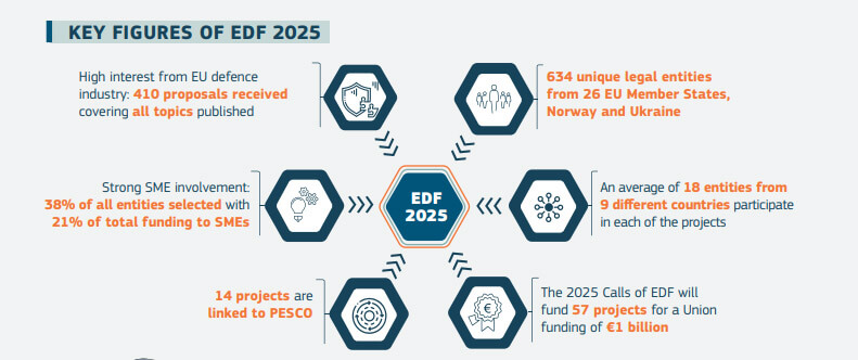 El Fondo Europeo de Defensa, dotado con 7.300 millones de euros para el periodo 2021-2027, se consolida como el principal mecanismo comunitario para fomentar la cooperación en investigación y desarrollo en defensa. Además de promover la colaboración entre empresas e instituciones de investigación, el EDF impulsa la transformación del ecosistema industrial a través del esquema de innovación EUDIS.