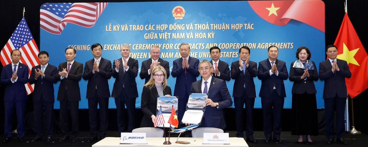 Funcionarios del gobierno de Vietnam y Estados Unidos se unieron a Stephanie Pope, presidenta y directora ejecutiva de Boeing Commercial Airplanes, y a Dang Ngoc Hoa, presidente de la junta directiva de Vietnam Airlines, en una ceremonia en Washington, DC hoy para anunciar un pedido de 50 aviones 737 MAX.
