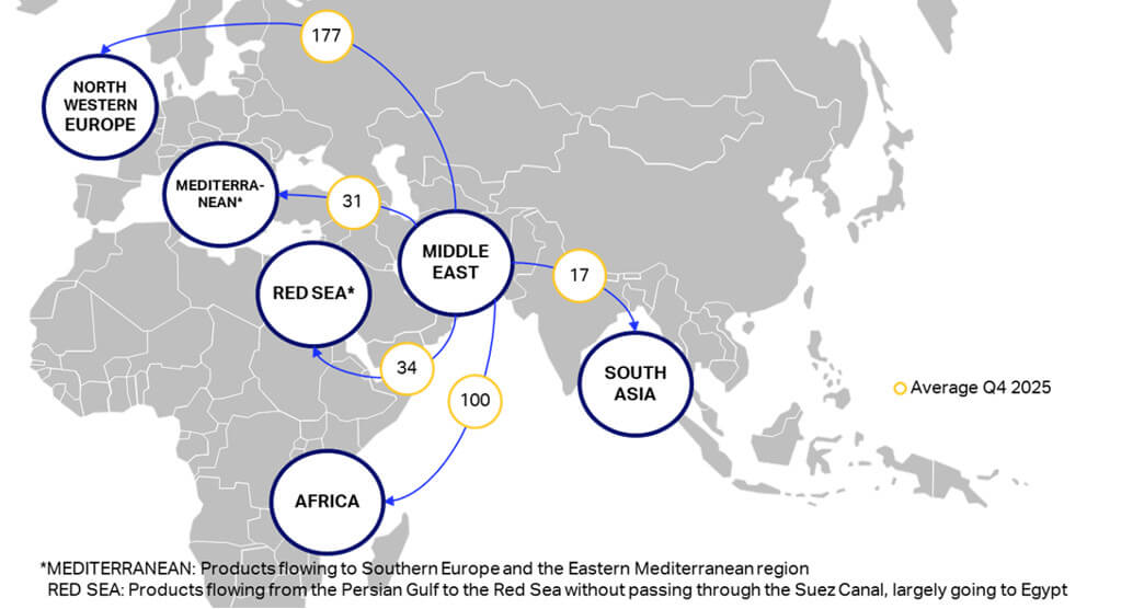 Europa se encuentra entre los países más expuestos, con entre el 25% y el 30% de su demanda de combustible para aviones procedente del Golfo Pérsico. La repentina reducción de la capacidad de transporte marítimo y el fuerte aumento de las primas de seguros han reducido la disponibilidad, lo que ha impulsado considerablemente los precios del combustible para aviones y las primas de los productos, en medio de la creciente preocupación por la escasez de combustible.