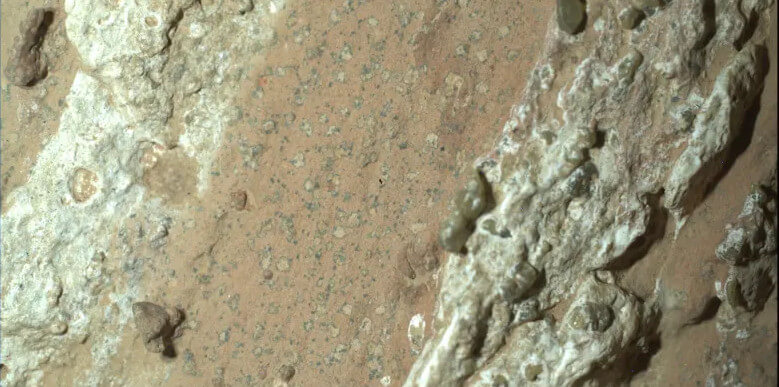 A lo largo de la roca se extienden grandes vetas blancas de sulfato de calcio. Entre ellas hay bandas de material cuyo color rojizo sugiere la presencia de hematita, uno de los minerales que le da a Marte su característico tono oxidado. Cuando Perseverance examinó más de cerca estas regiones rojas, encontró docenas de manchas blanquecinas de forma irregular y tamaño milimétrico, cada una rodeada de material negro, similar a las manchas de un leopardo. El instrumento PIXL (Planetary Instrument for X-ray Lithochemistry) de Perseverance ha determinado que estos halos negros contienen hierro y fosfato.